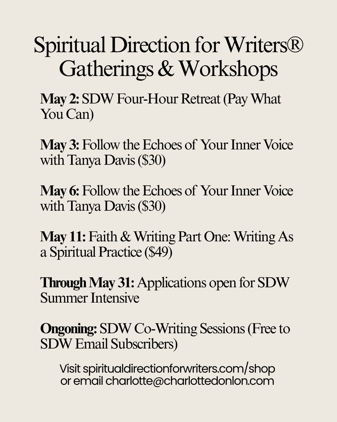 May 2026 Spiritual Direction for Writers® Offerings, Gatherings, & Workshops